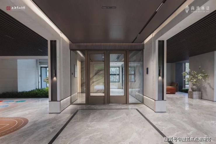 进入南入户大堂,能感受到具有仪式感的现代轻奢设计,灰色大面铝板搭配金色格栅,每一次入户都能体验到无比尊崇的感觉。内部墙面做了大面积岩板,以及具有设计感的吊顶,更贴心地配备了空调,营造舒适的环境。