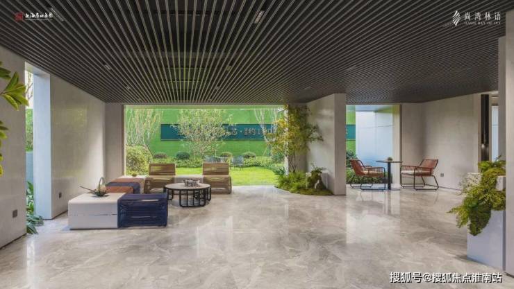 52幢一楼的架空层,更打造儿童活动区、会客厅等功能场景,提供了一个能遮风避雨的户外功能场地。架空层运用面砖,并搭配金属格栅吊顶进行打造,使其既高端大气又经久耐用。