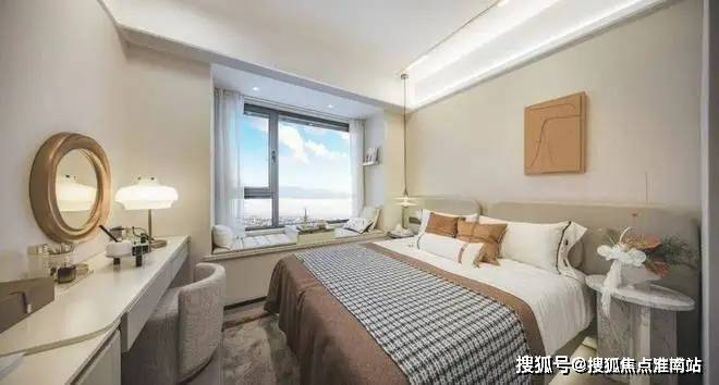 但保利虹桥和颂主卧南向增加了半米的开间,这样就能在床尾设计一个梳妆台或者书桌,让主卧具备更强的功能性,实现真正的小家化!