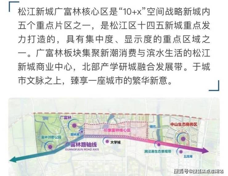松江新城广富林核心区是“10+x”空间战略新城内五个重点片区之一,是松江区十四五新城重点发力打造的,具有集中度、显示度的重点区域之一。广富林板块集聚新潮消费与滨水生活的松江新城商业中心,北部产学研城融合发展带。于城市文脉之上,臻享一座城市的繁华新意。