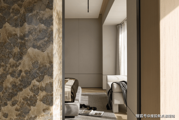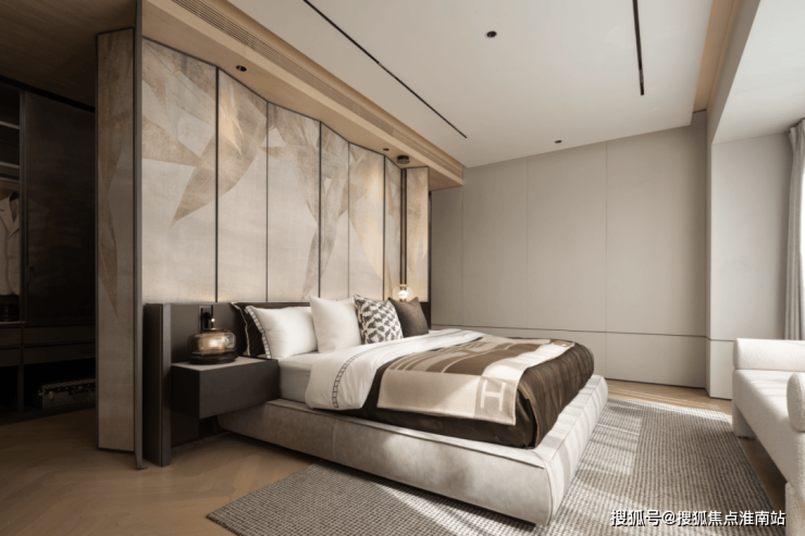 主卧背景墙巧用了折扇理念,运用屏风开阖的变化,在平面与立体结构之中,为空间增添虚与实的魅力。