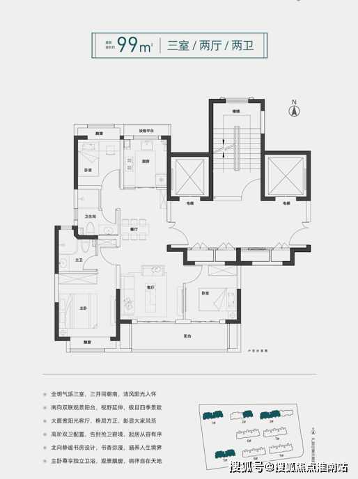 建面约99㎡3房2卫为飞机户型,三开间朝南,南北通透,并约5米双开间阳台,使得整个家庭公共区域尺度感十足。