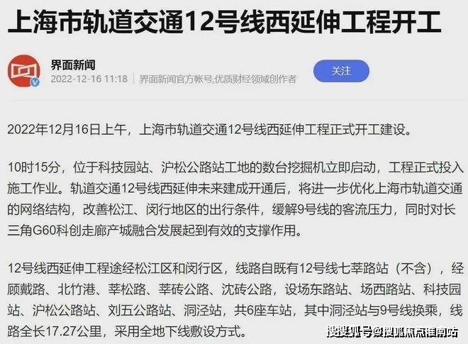 目前12号线西延伸正在加速推进,预计2027年底开通试运营。12号线西延伸在松江境内从G60云廊沿沈砖公路,东西向穿过洞泾,设沪松公路和刘五公路设站,在洞泾站与9号线交汇。