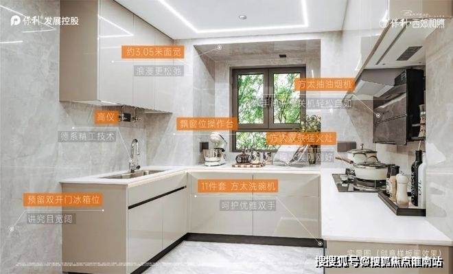 U型厨房带飘窗的设计,左侧预留了双开门冰箱位置,让整个空间的利用率更高。