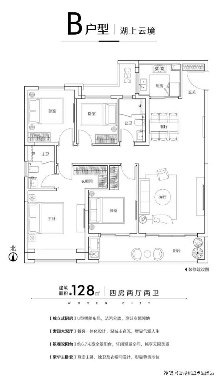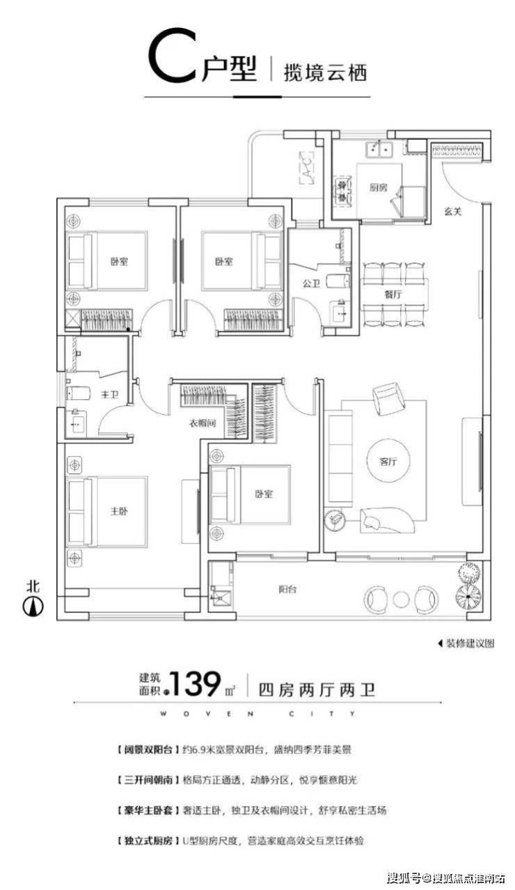 以建筑面积约139㎡为例:“四叶草”设计,让四个卧室格局独立,每位家庭成员都可以享受到无比舒适的起居尺度和私密生活;客餐厅一体化设计,集合了欢聚时光与亲密关系,营造出开放的互动场景;与宽厅自由接洽的跑道式阳台,更打破了空间界限,迎纳风景与阳光入室。