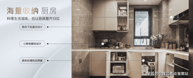 橱柜收纳系统:特别预置洗碗机点位、柜内下拉篮式设计、不锈钢挡油板、柜下操作灯、烹饪全流程功能动线一体化设计;