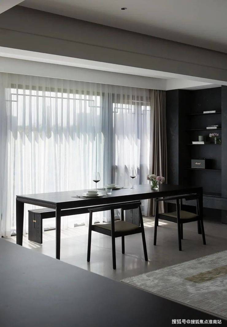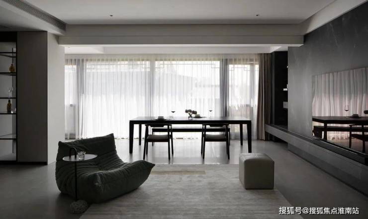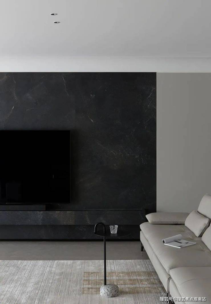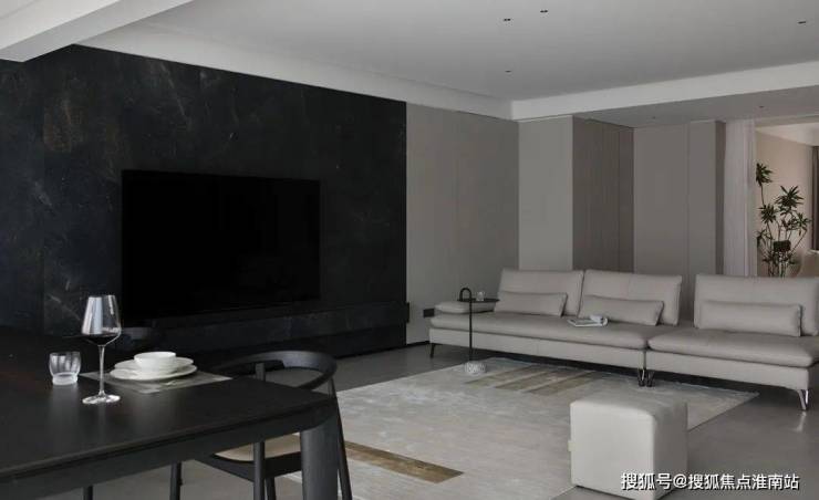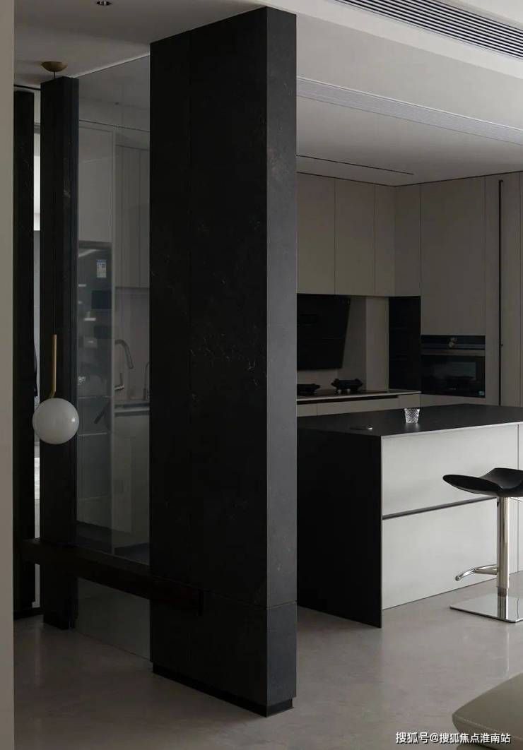 空间里也藏着很多不同视角下的结构美学,比如由黑色岩板打造的电视背景墙成为客厅的视觉标志,随之展开的灰色大块面的柜体或门洞,都以极致工整的形态共同加持空间的理性秩序。