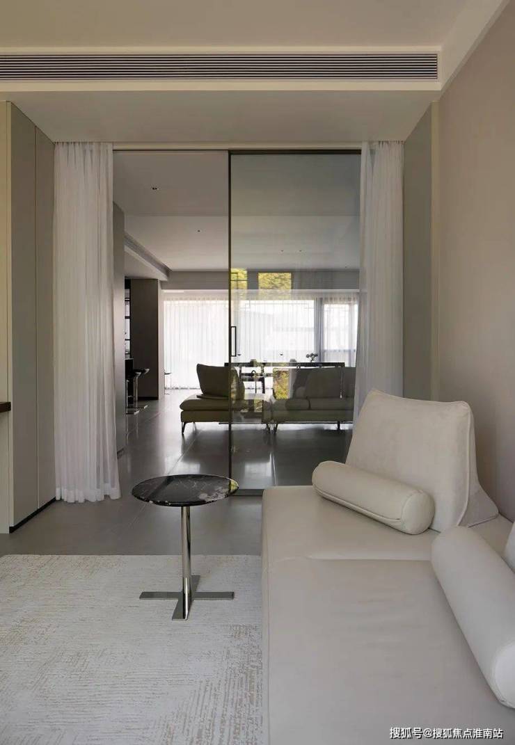 与客厅拉通的休闲室原本是一间卧室,通过家居的简单陈设,这个房间可以满足阅读、看电影、音乐、瑜伽、冥想、休息放松等多种功能。用大块面玻璃作为空间隔断使其开放与封闭切换自如,用极窄边框削弱空间的分割,在视觉上减少竖向线条,以达到纯粹至简的视觉体系。