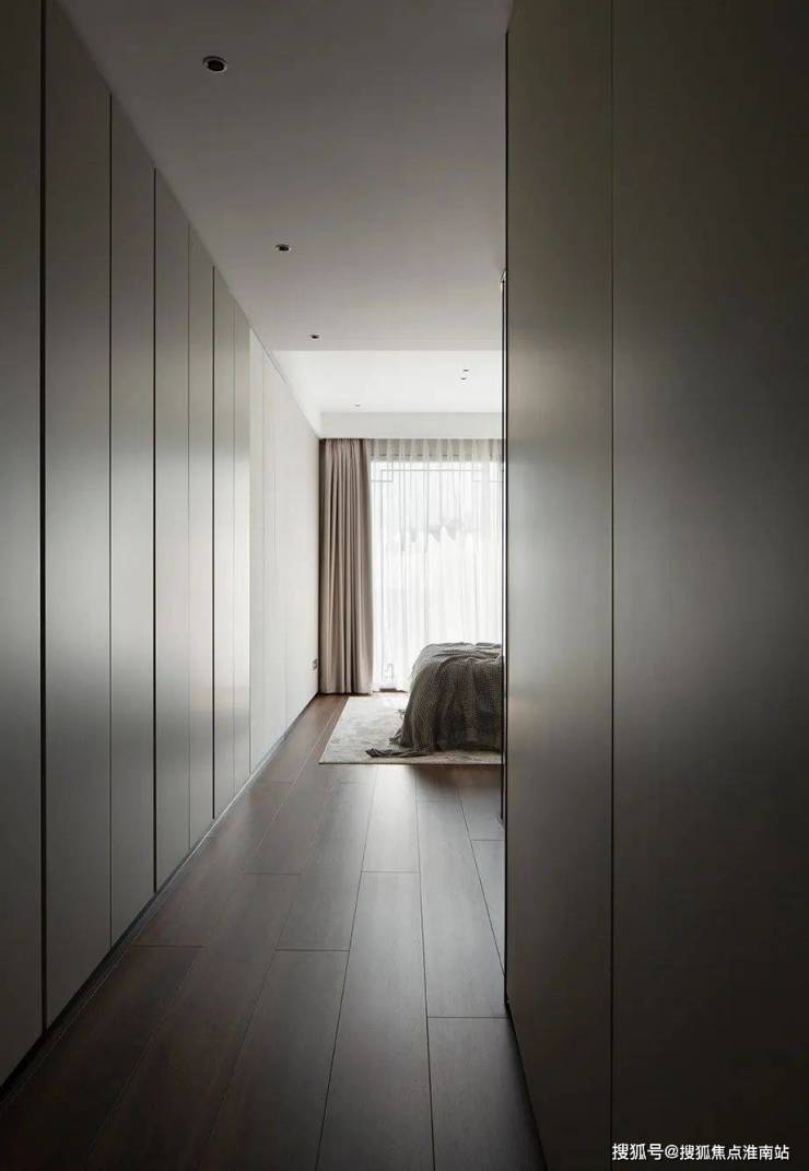 通过隐形门进入的主卧空间,由灰色调掌控全场,因布局缺陷而舍弃掉的衣帽间,以其统一工整的形态驻足于通往休息区的通道,成为极好的功能区域。