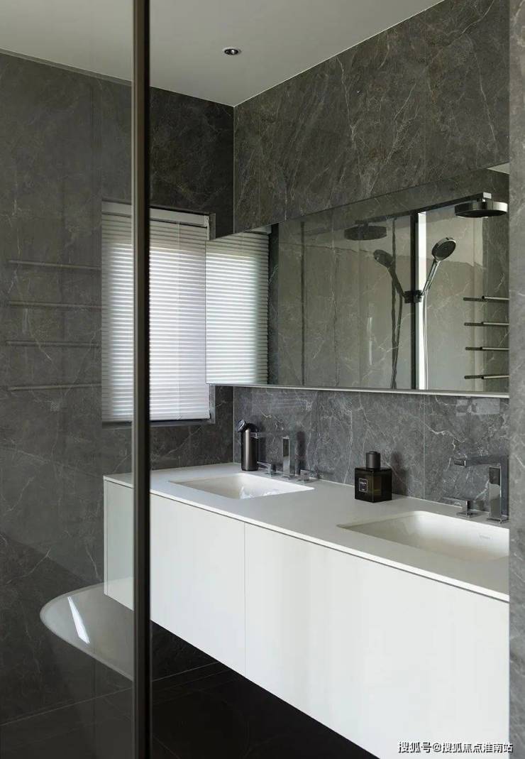 右侧经由主卫的独立马桶区、洗漱区和淋浴区,弧形玻璃围合而成的主卫湿区缔造了空间的独特体验,通透明朗又细腻温润,简洁利落地营造出自然恬静的居住氛围。