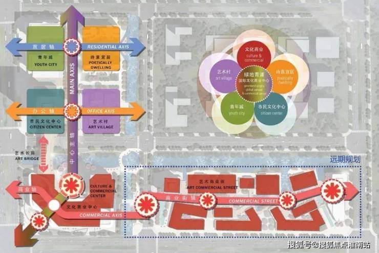 北侧地块沿外青松公路布置两栋高层商业和一栋地标性塔楼, 形成完整的城市界面。地标塔楼的主入口广场位于外青松公路与水渡浜路交叉口,方便到达,具有很强的标识性,塑造青浦市民文化中心的典范。住宅区位于地块东北角,靠近中横径水系,环境安静优雅,景观宜人宜居,视野开阔,形成优良的居住社区。水渡浜路北侧靠近中横径水系区域为艺术商业聚落,打造具有水乡特色的艺术商业街区。