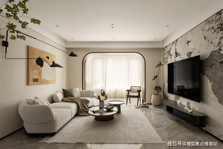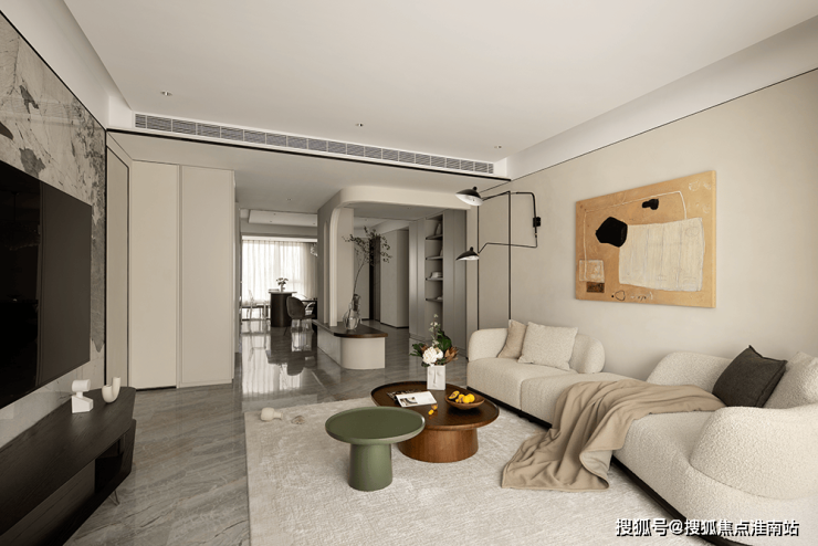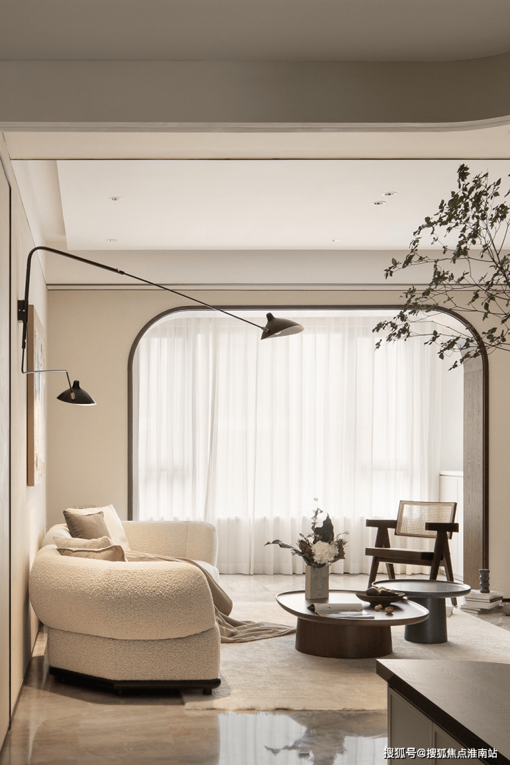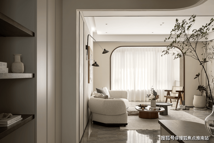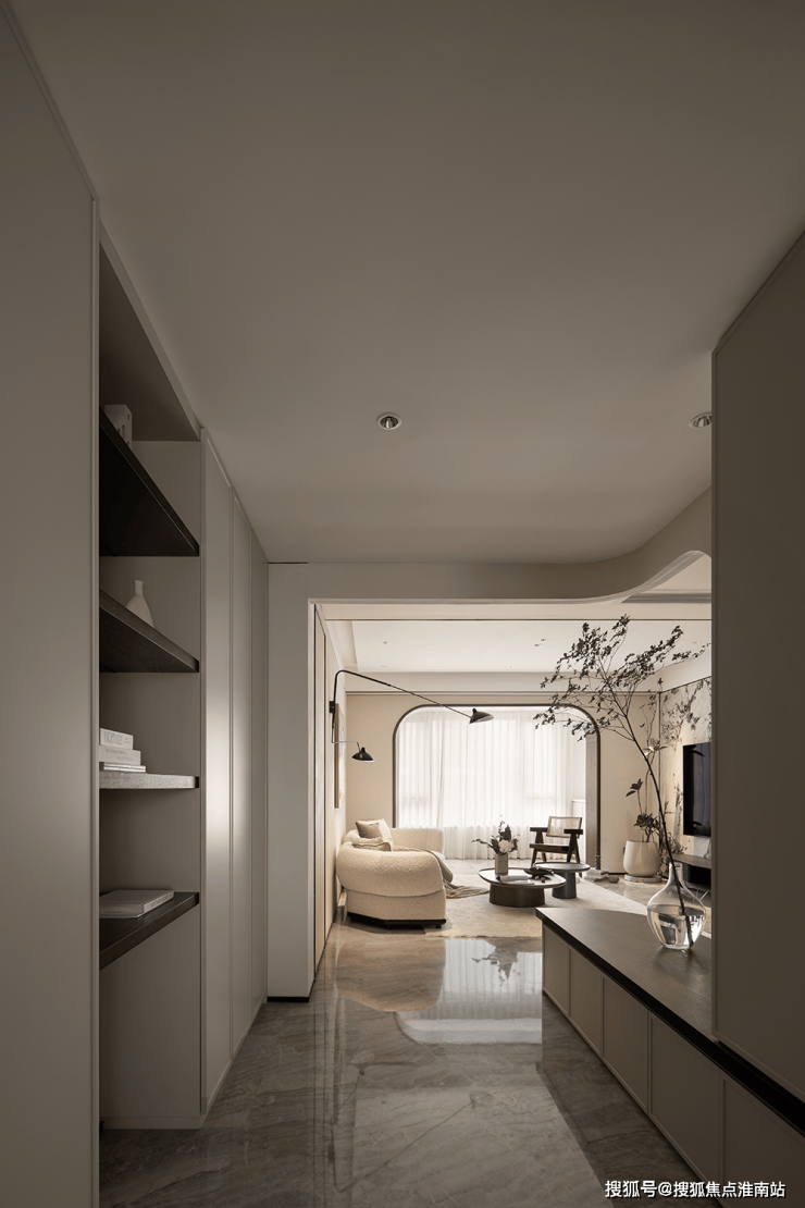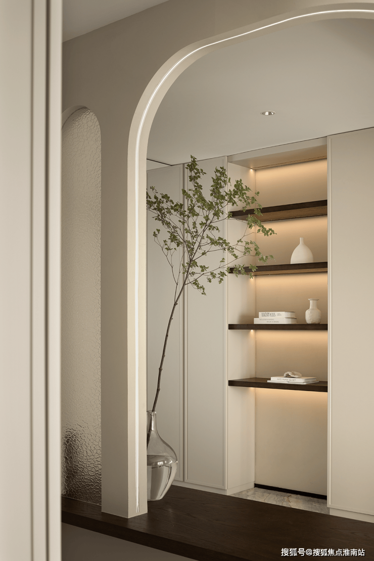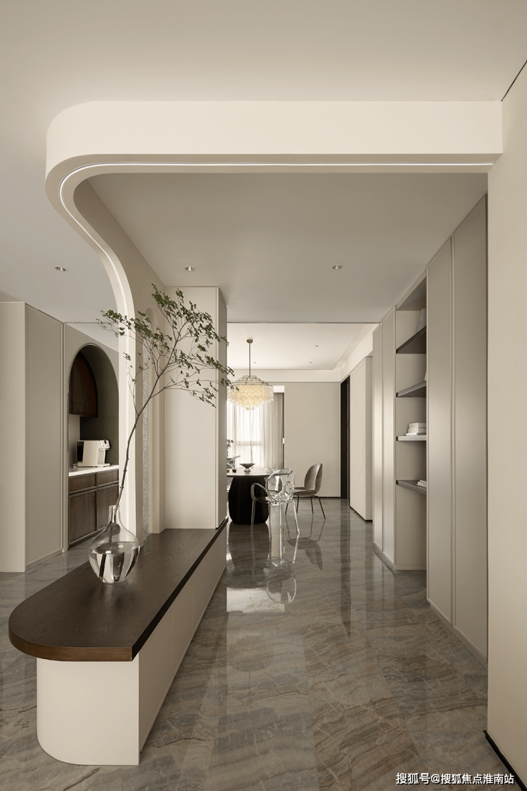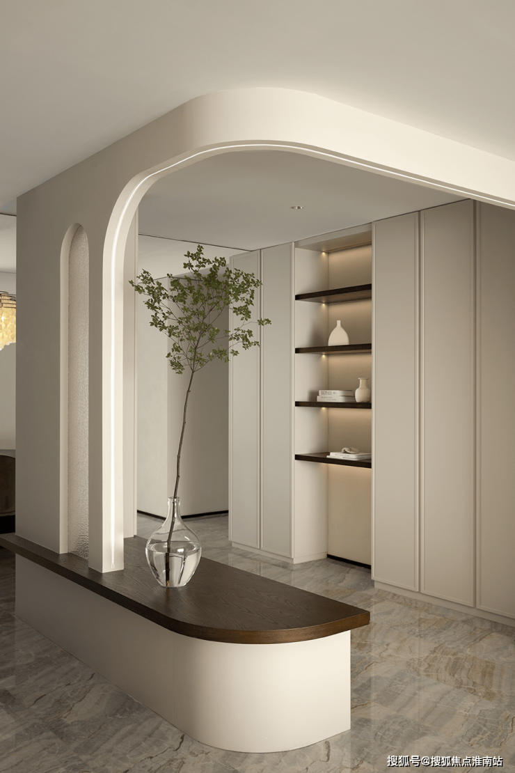 挑高扇形弧度造型、内置收纳玄关柜,与自然质感的材质虚实结合,绿植与灯光适度渲染,当走进门厅的刹那,便可领略出屋主不俗的品味。