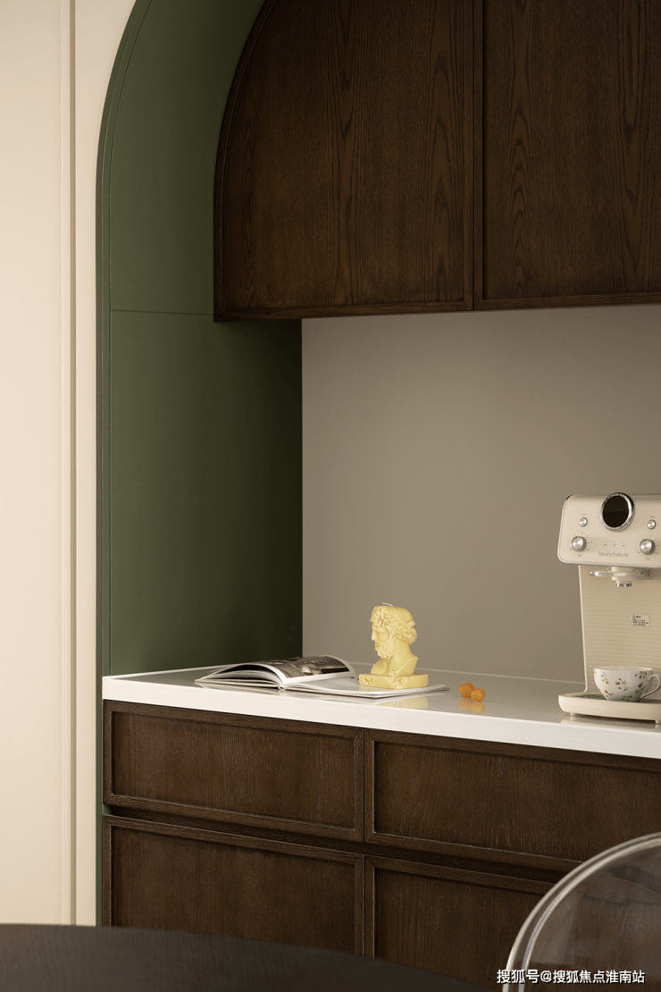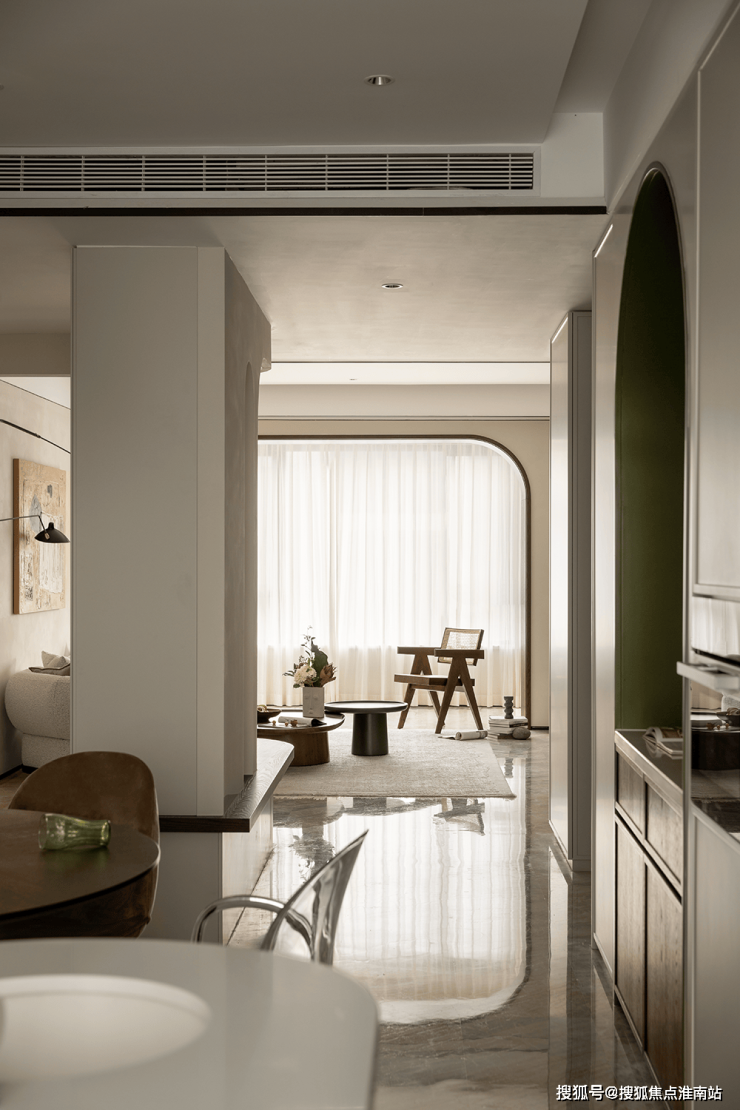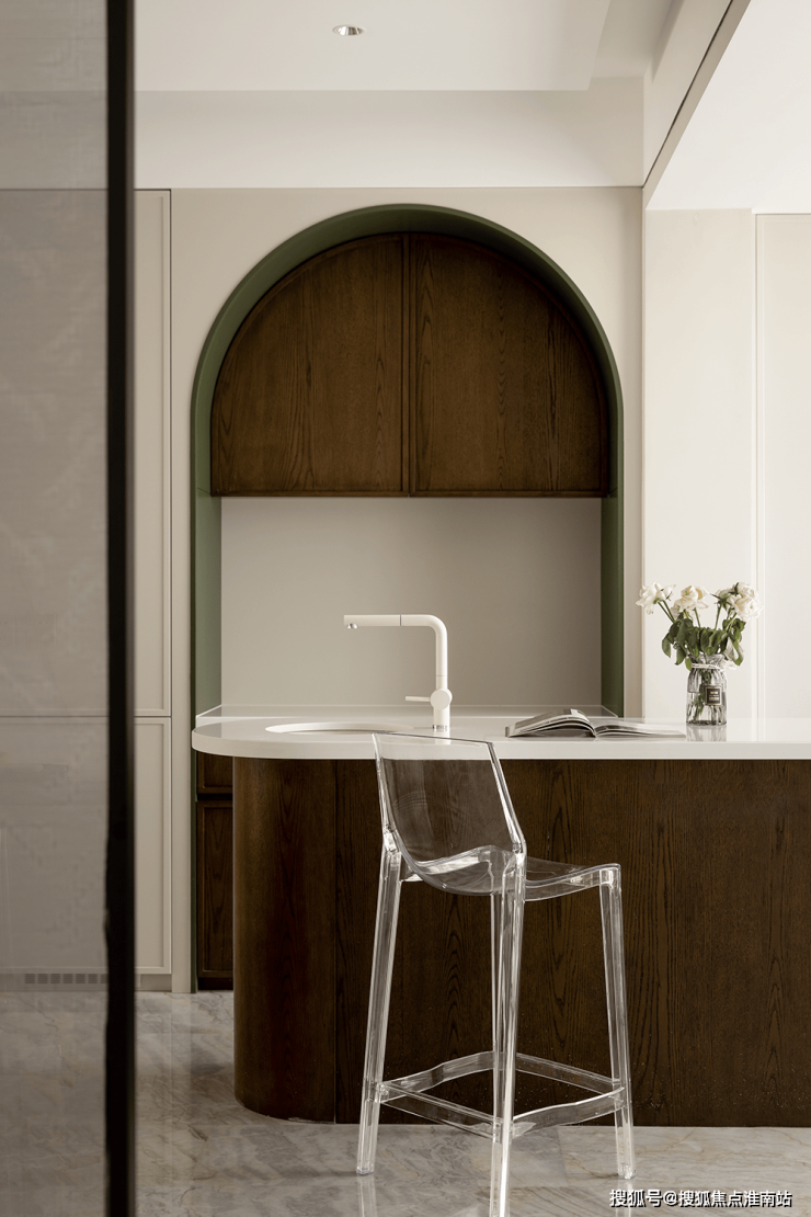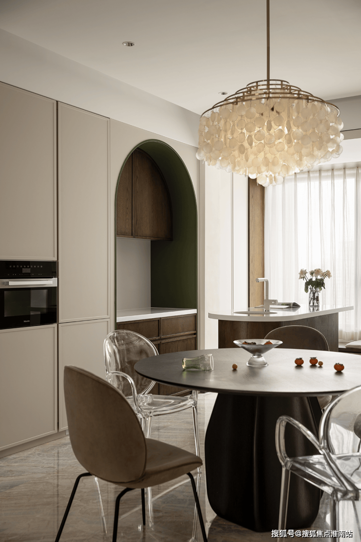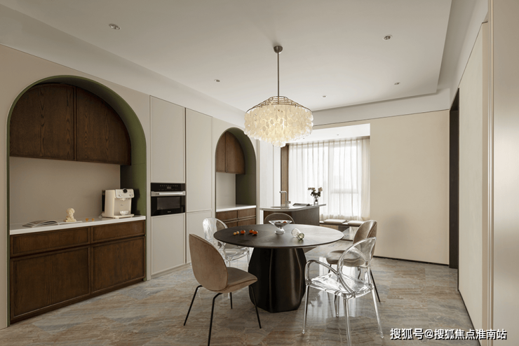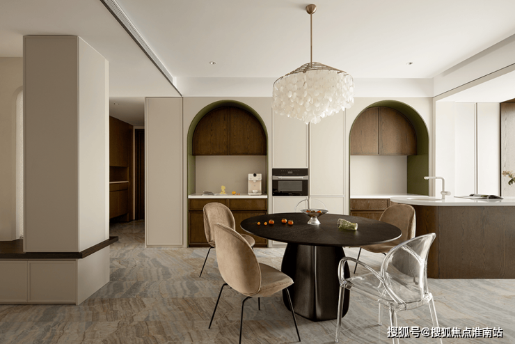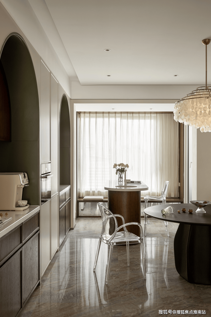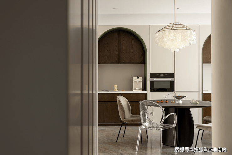 内置双拱门造型,利用空间穿插、错景,划分餐厅与西厨区,开放互动气质与当代审美相结合,隔而不断,界而未界,留给空间更多的想象和延伸。