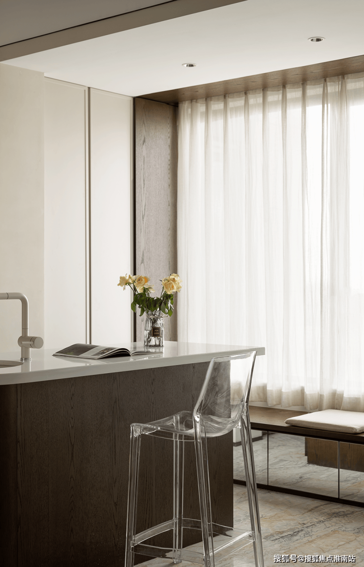 岛台旁卡座与底面镜子的设计,以虚实结合的手法,增加了收纳性和空间延伸感。