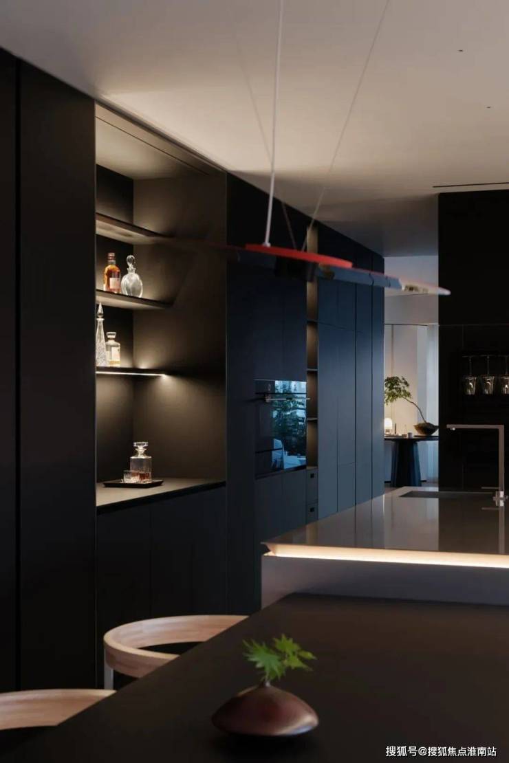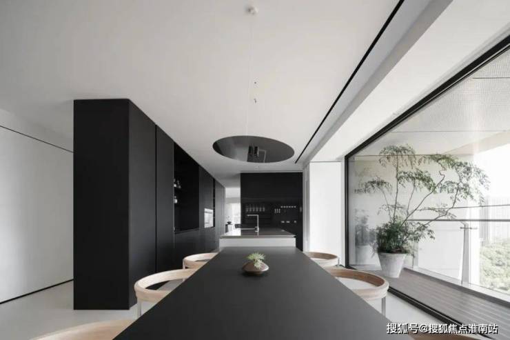 黑色的餐桌连接着不锈钢岛台,极简的餐椅、窗外美丽的城市夜景构成了艺术氛围浓厚的就餐环境。