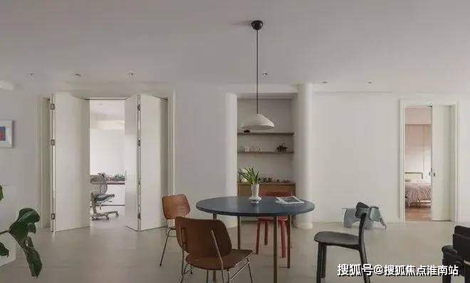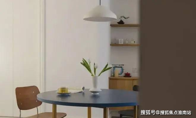 餐桌椅在材质与色彩上,均为低饱和度,且造型流畅、简约,与全屋的白+木和谐搭配。