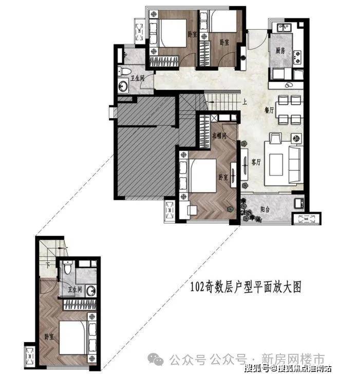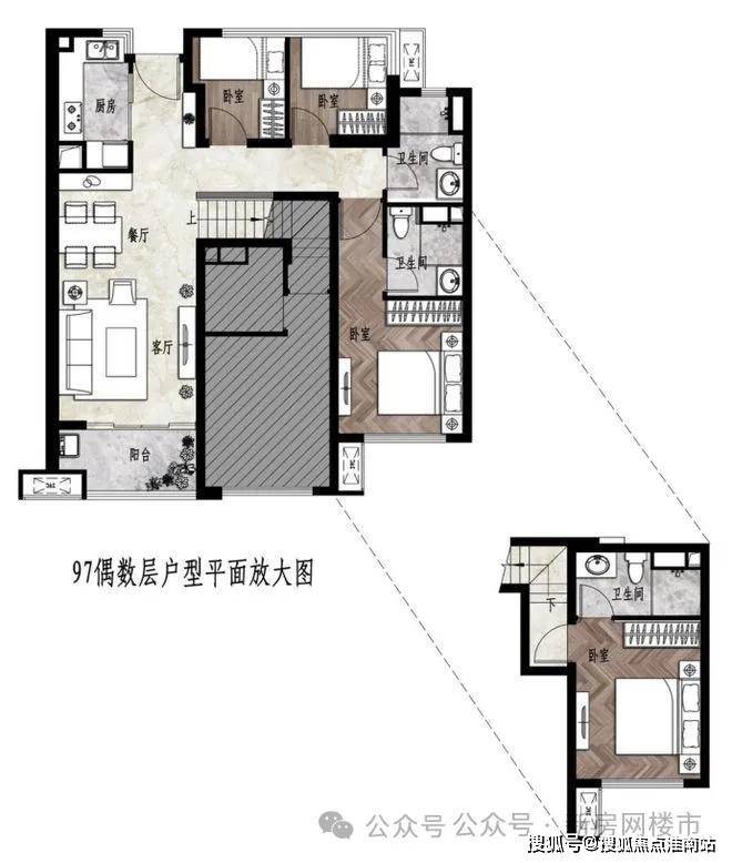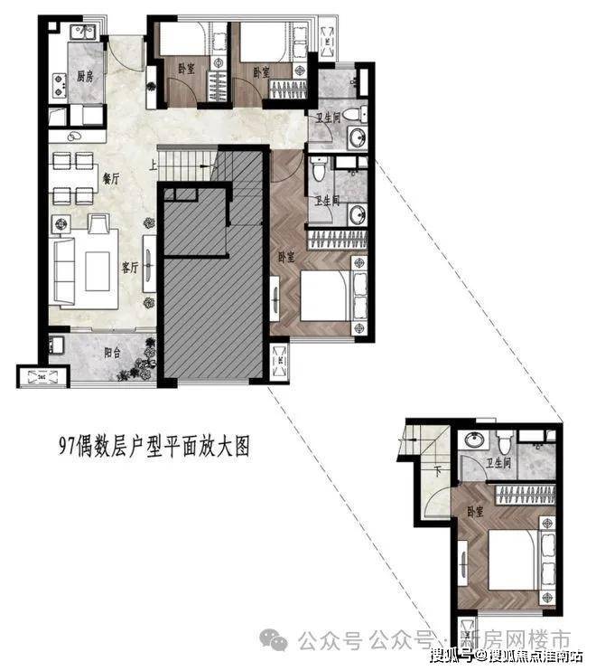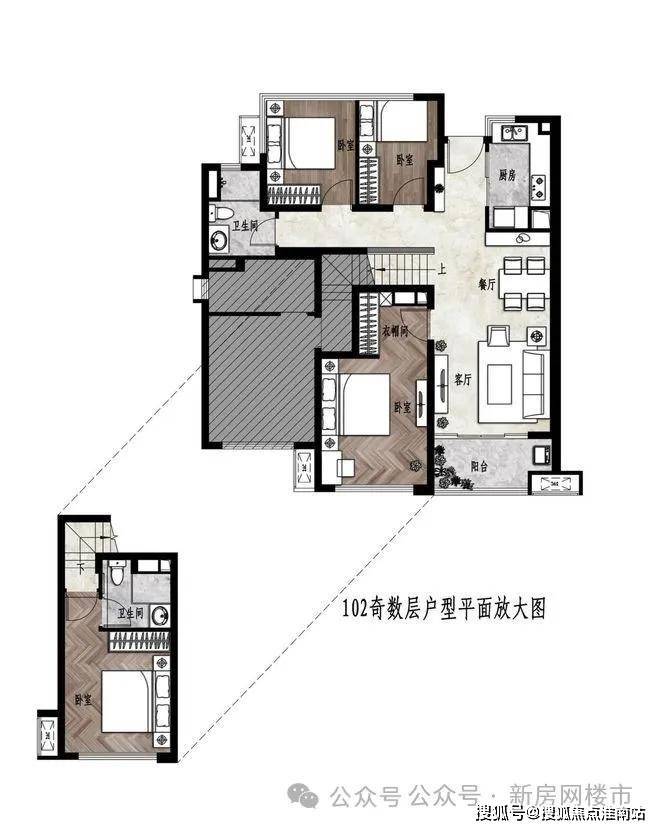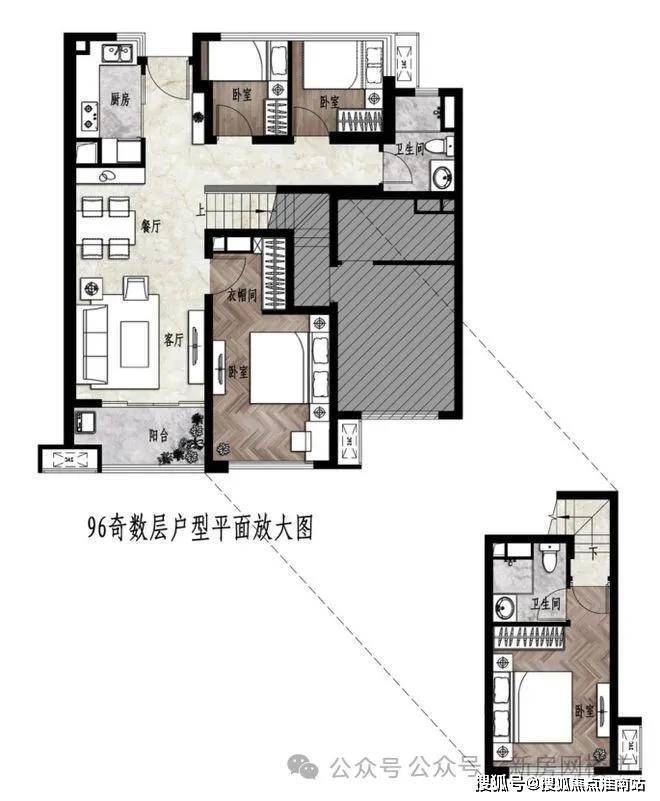 户内楼面高度不一致,错开之处有楼梯联系。但没有完全分为两层。(适合大面积住宅,小户型会显得局促)