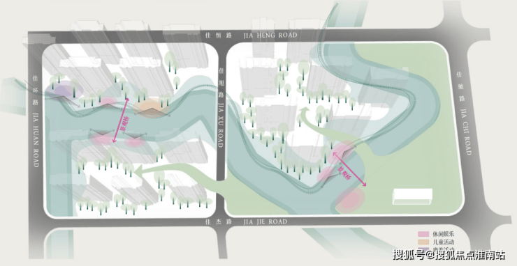 比如结合不同季节,选择四季植被铺设,沿着两条河岸线布置,四季景观皆不同。