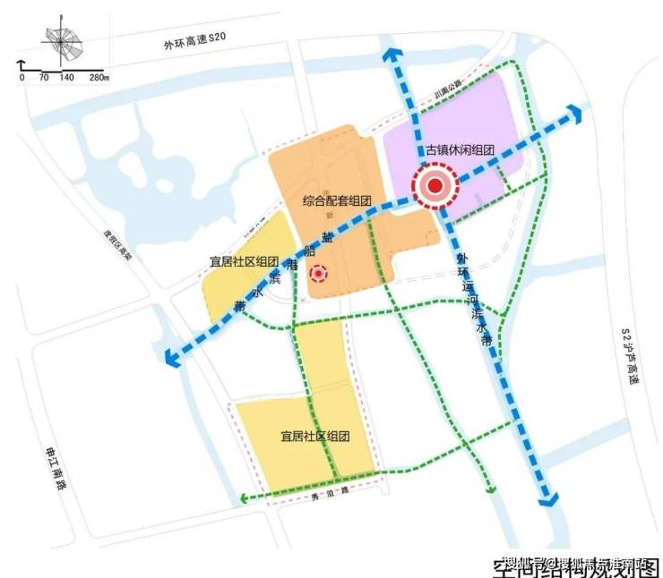这里将形成“一心、两廊、三组团”的总体空间结构,即以横沔老街历史文化风貌区为核心,保护并延续盐船港和外环运河十字浜水廊的空间格局,形成以古镇休闲、综合配套、宜居社区为主要功能的三大组团。