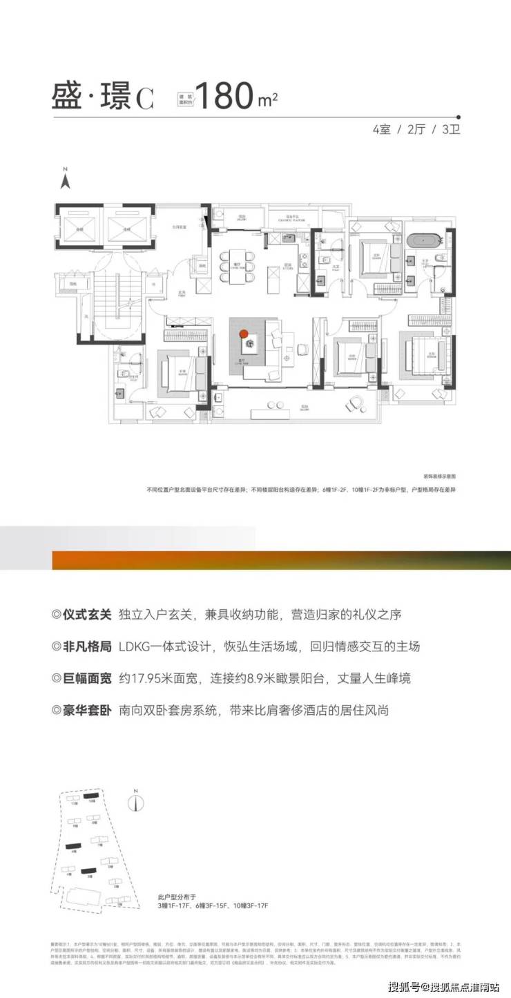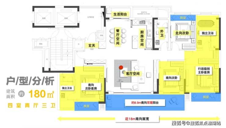 建面约180㎡ 的终极改善户型为4房2厅3卫的设计,五开间朝南,南向开间达到了惊人