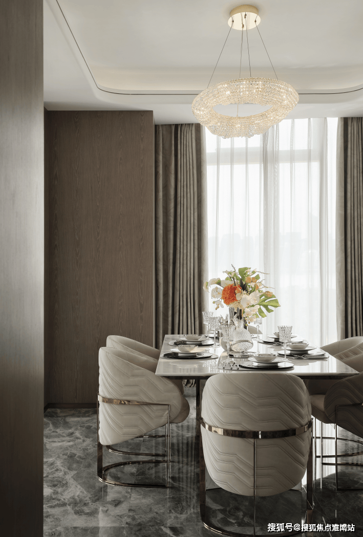 开放的客餐厅打破桎梏,餐桌选择了金属与石材结合的独特设计。在完美的采光环境下,让每一次品尝美食的过程也充满仪式感。水纹座椅呼应房间临江主题,让浮动的波纹化为稳固的装饰,承托住和家人一起分享的美好回忆。