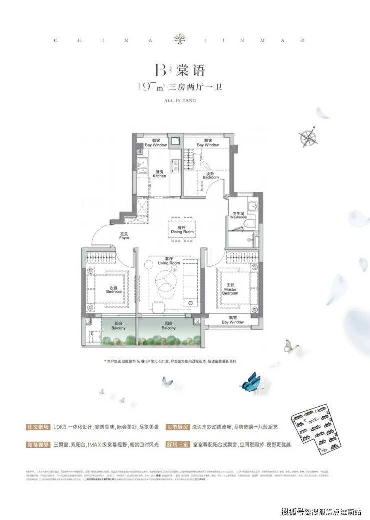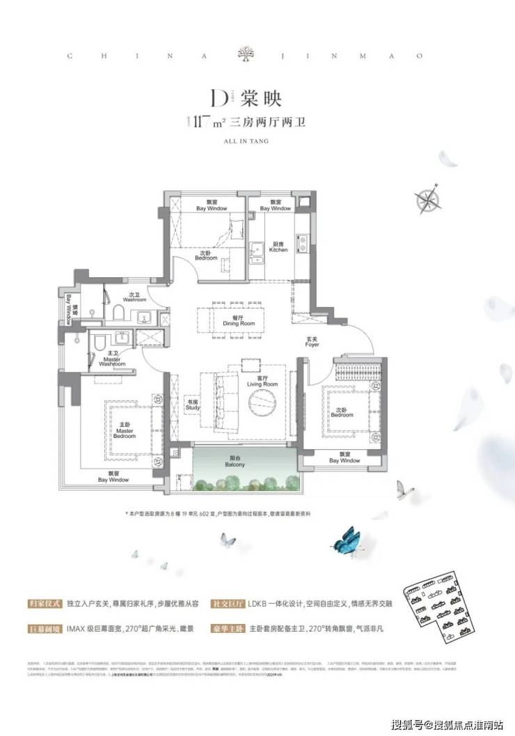 建面约117㎡三房:同样飞机户型,做到了惊人的3开间朝南+4个飘窗+主卧套房设计+270°转角飘窗,尺度感大大提升,一步到位的大三房户型,定义终极改善标准!