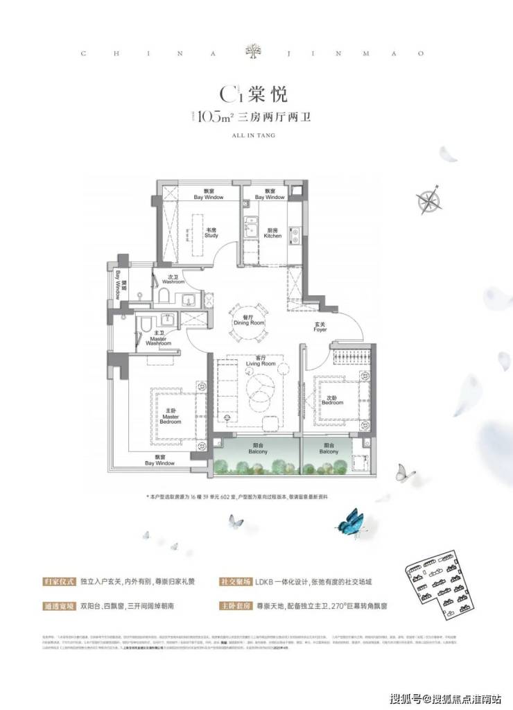 建面约105㎡三房:飞机户型没有浪费的过道面积,对空间的理解做到了极致,三开间朝南+4个飘窗+双面阳台系统+主卧套房设计+270°转角飘窗!