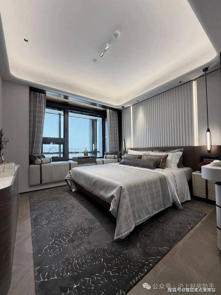 吊顶采用一体化大平顶加回型吊顶设计,并且在四个角均匀做了圆弧处理,让整个空间感更加和谐圆润。