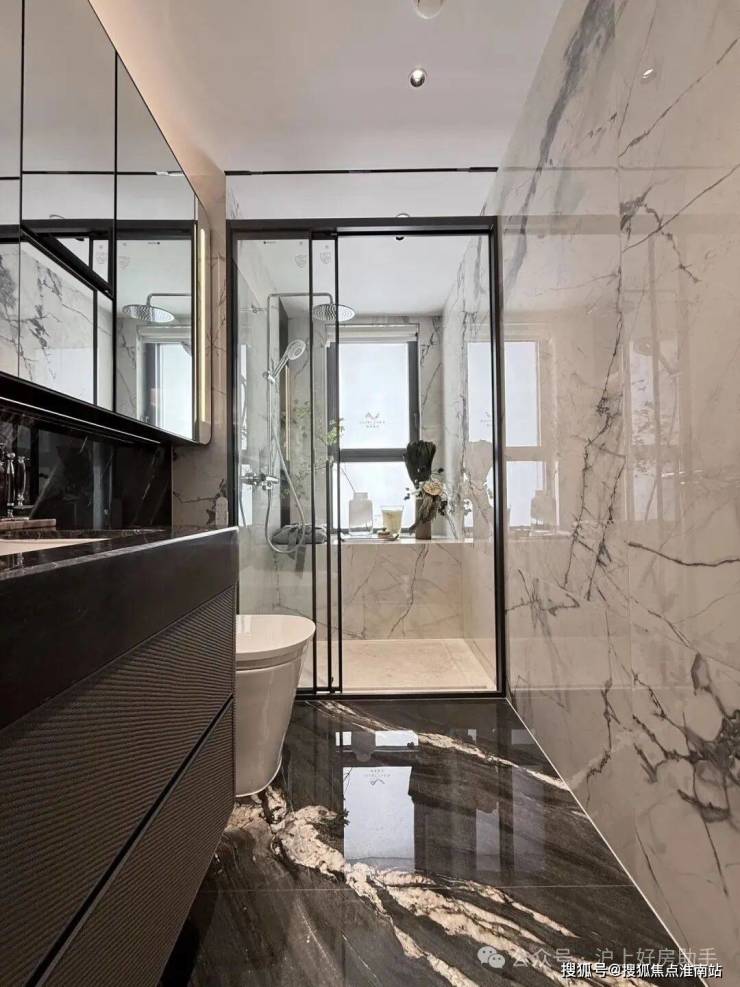 卫浴墙面采用寒江雪大瓷砖铺装,淋浴部分地面选用整块天然大理石。