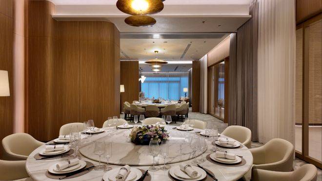 项目外立面呈现蝴蝶状的优雅造型,流动的立面与波光粼粼相互呼应,曲线模仿“飘带”线条,进口浅色花岗岩,结合金属铝板包边,形成“金镶玉"的高级质感,贵气十足又不失灵动曲线之美。