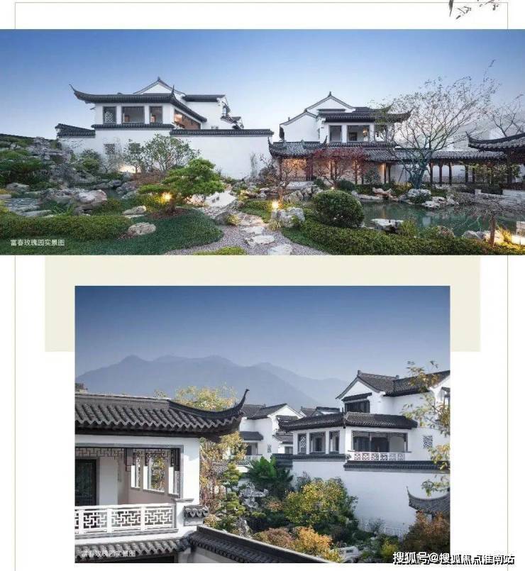 富春玫瑰园中国院子除传承绿城中式产品中的青瓦白墙、飞檐庑廊、影壁漏窗、水榭亭台等中式建筑元素外,为了不辜负从《富春山居图》中走出来的山水大境,在设计上我们还原苏州园林【园院宅阁】体系,极大限度的将富春山水收藏入室。