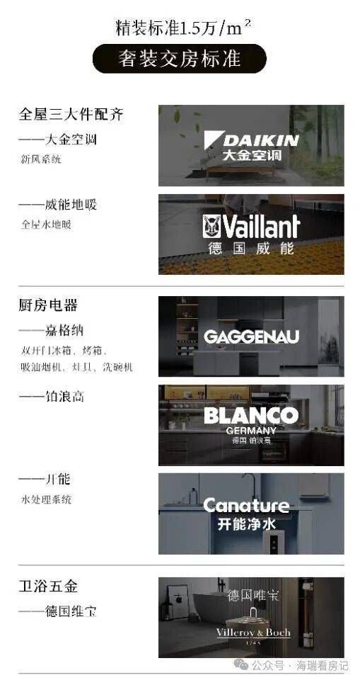 交付标准:1.5万/㎡国际精装(配大金中央空调、威能地暖、霍尼韦尔新风)