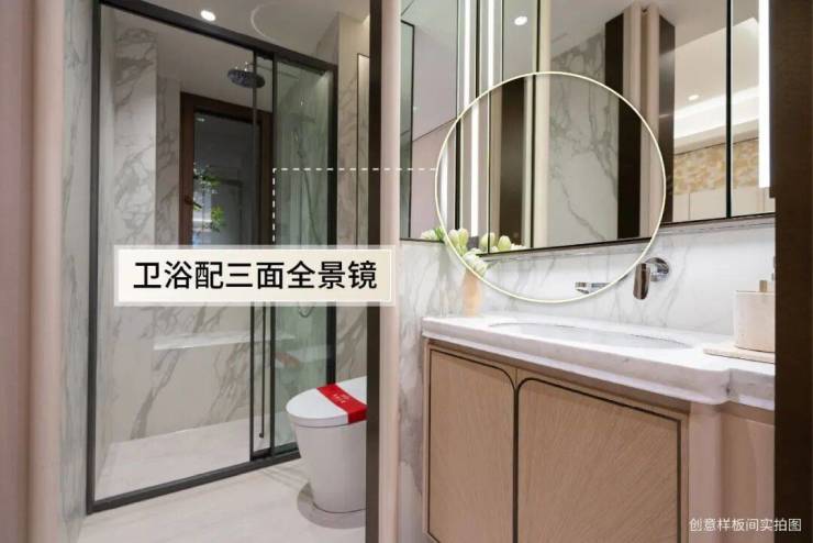 镜子是三面镜,女士打理发型、查看背部穿搭都更方便;主卫还定制美妆冰箱,贴心满满。