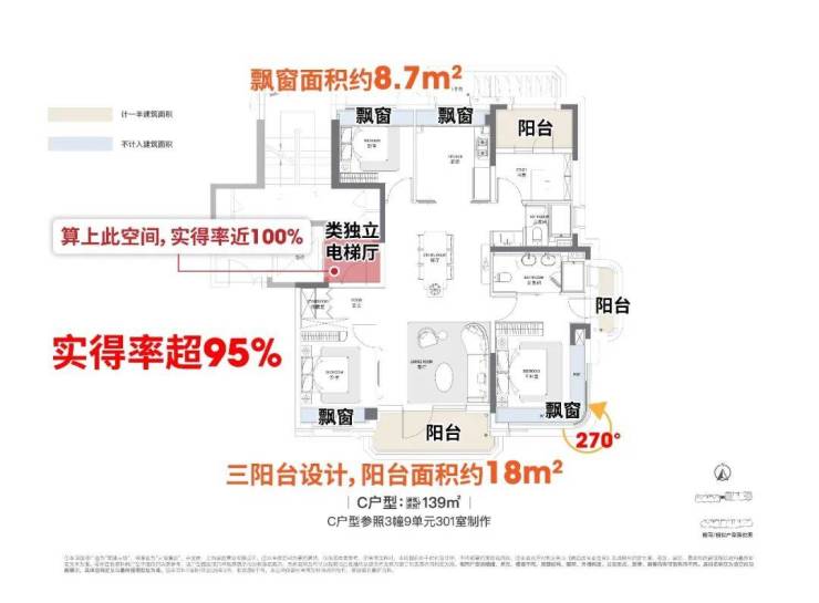 尤其约139㎡,配备双开门电梯,享类独立电梯厅,把这部分附加使用面积算上,整体实得率逼近100%!实际使用面积堪比市面建面约160㎡户型。