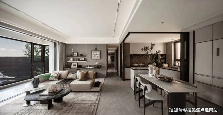 超过5m的南向宽景阳台,全景落地窗的搭配,观景视野开阔!值得一提的是,从客厅到阳台,地面都是通铺的仿石砖大规格柔光砖,真正实现空间一体化。