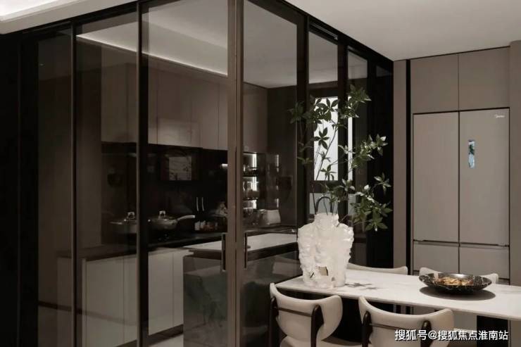 L型开敞厨房,灶台墙面特地采用大尺寸仿石材陶瓷大板,而非普通瓷砖,3.0版的超薄石英石台面,耐污且便于清洁;上滑道吊柜金属移门设计,美观简洁!