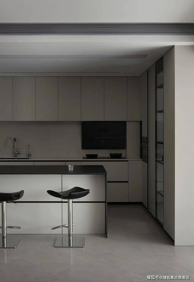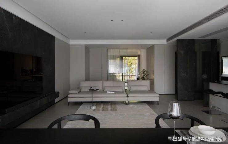 空间里也藏着很多不同视角下的结构美学,比如由黑色岩板打造的电视背景墙成为客厅的视觉标志,随之展开的灰色大块面的柜体或门洞,都以极致工整的形态共同加持空间的理性秩序。