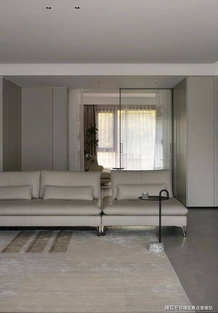 与客厅拉通的休闲室原本是一间卧室,通过家居的简单陈设,这个房间可以满足阅读、看电影、音乐、瑜伽、冥想、休息放松等多种功能。用大块面玻璃作为空间隔断使其开放与封闭切换自如,用极窄边框削弱空间的分割,在视觉上减少竖向线条,以达到纯粹至简的视觉体系。