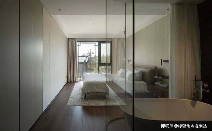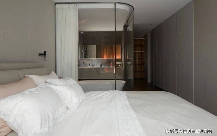 右侧经由主卫的独立马桶区、洗漱区和淋浴区,弧形玻璃围合而成的主卫湿区缔造了空间的独特体验,通透明朗又细腻温润,简洁利落地营造出自然恬静的居住氛围。