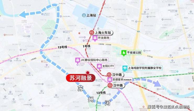 落位到具体交通,苏河融景步行可达(约200米)城心无比重要的十字交错站点——1/12/13号线汉中路站,进站后2站人民广场,2站南京西路、2站北外滩。