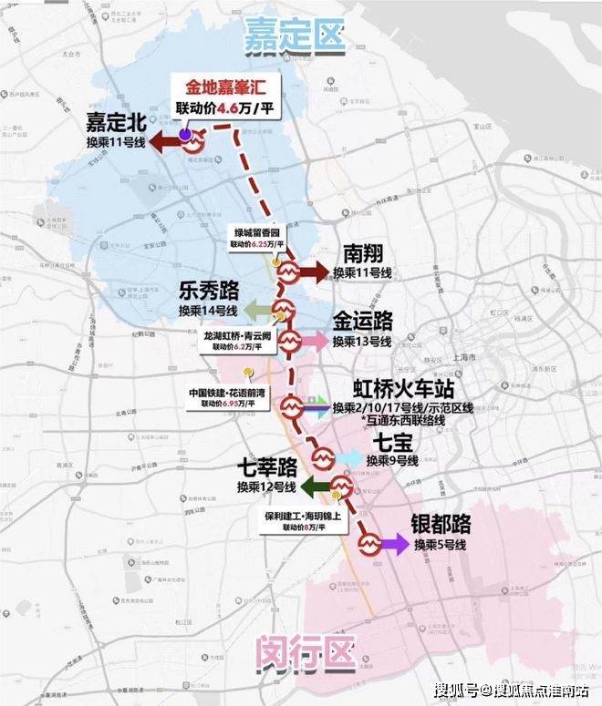 直线距离约200米嘉闵线(在建),8站直达大虹桥,连接七宝、莘庄等多个CBD,不论是上下班、聚会、商务出差等都十分便捷。另外值得一提的是沿线新盘均价均在6-8万区间,其中约350万总价的潜力盘或许只有金地嘉峯汇!