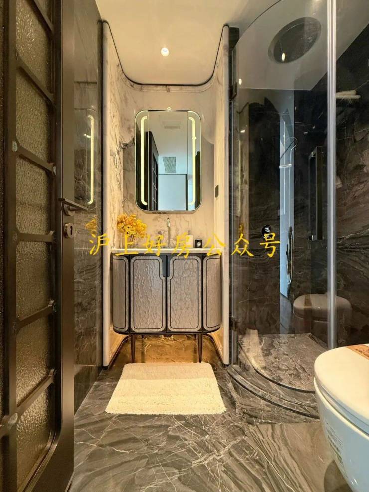 电视背景墙选用意大利超白洞石材;卫生间台面及墙面采用芬迪白;来自巴西进口的静雅棕石材在有些顶豪中仅用于卫生间点缀,而在绿城黄浦ONE,则将其大量运用于地面铺装