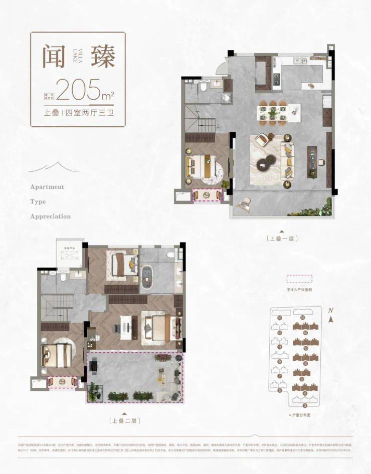 · 上叠:205㎡ 四房两厅三卫,赠送约22㎡阔景露台。