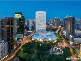 整栋建筑屋身层层飞檐、基座漂浮架空,巨幕玻璃立面,非常飘逸灵动。