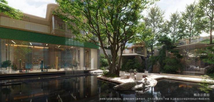 中建玖上琅宸以豫园为灵感,建设一了座当代山水隐园。在社区内部,遵循豫园山脉、水脉,以现代化手法表达,形成立体的山水园林景观,包括立体的山林、引水入园、庭荫树影。