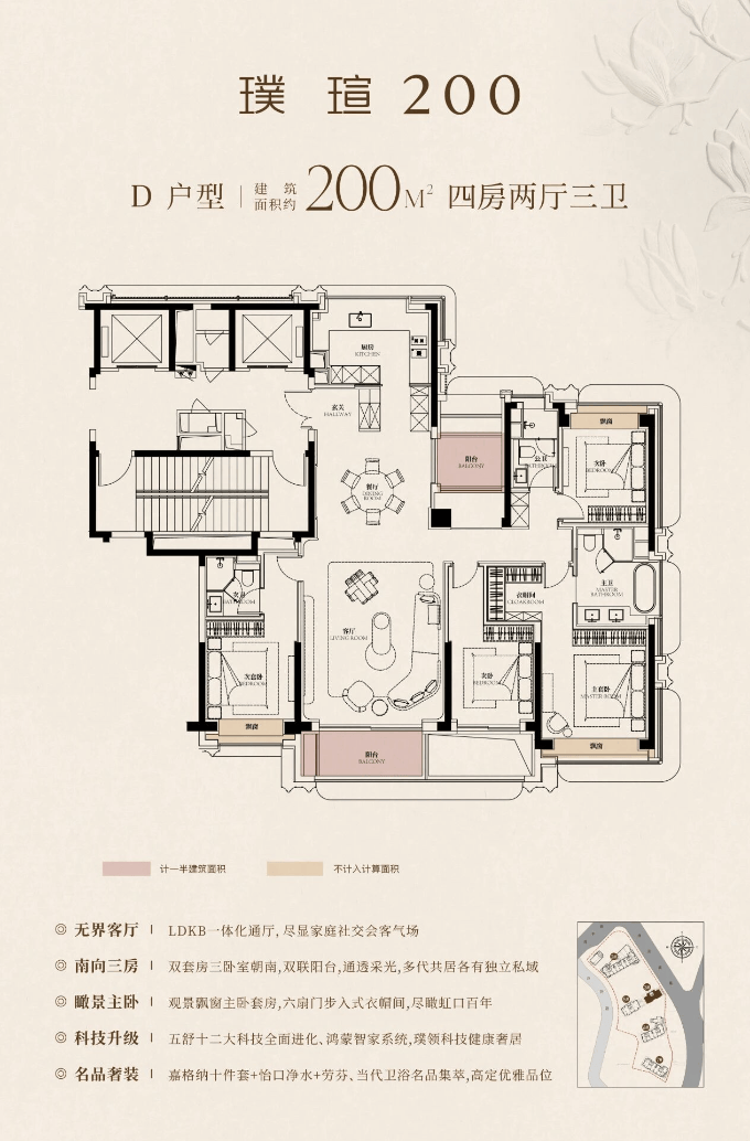 交付标准:装标不低于4000元/㎡,全屋配置嘉格纳厨电、劳芬卫浴等国际一线品牌,智能控制系统覆盖全宅