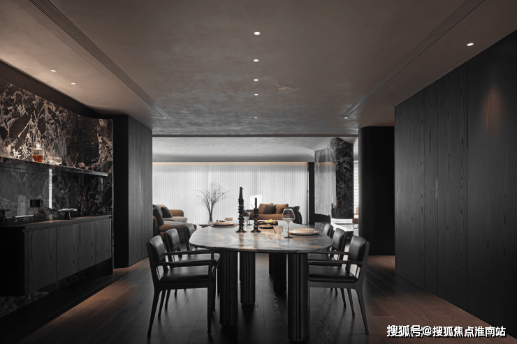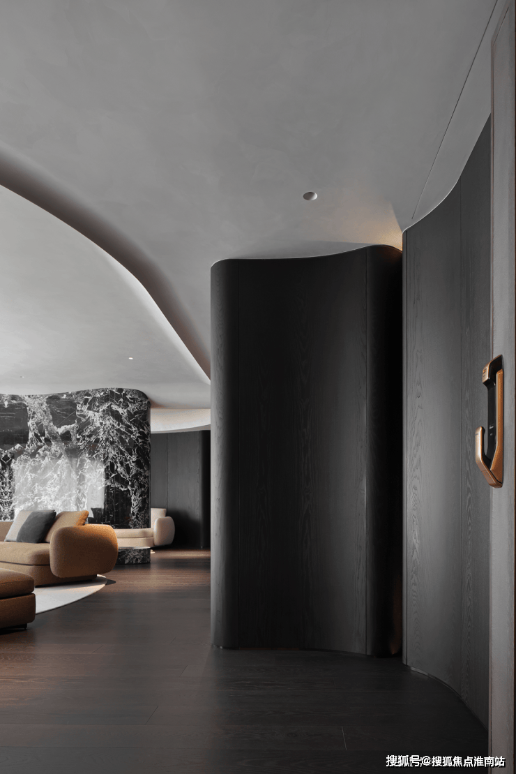 业主的想法与执著设计的理念不谋而合,满足功能性需求后,以“隐于形的诗意”为核心,通过精心策划,打破了线性空间的固有逻辑,于蜿蜒的曲线形态与深色空间画布中,缔造出明朗大气、优雅静谧的氛围感。