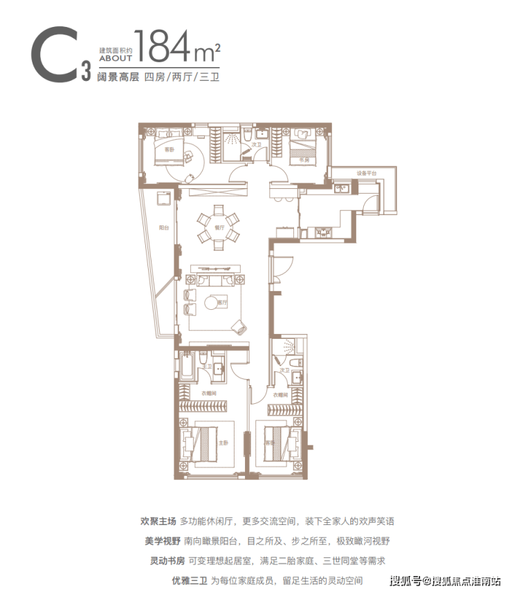 四房间呈四叶草布局分布于户型四角,互不打扰;