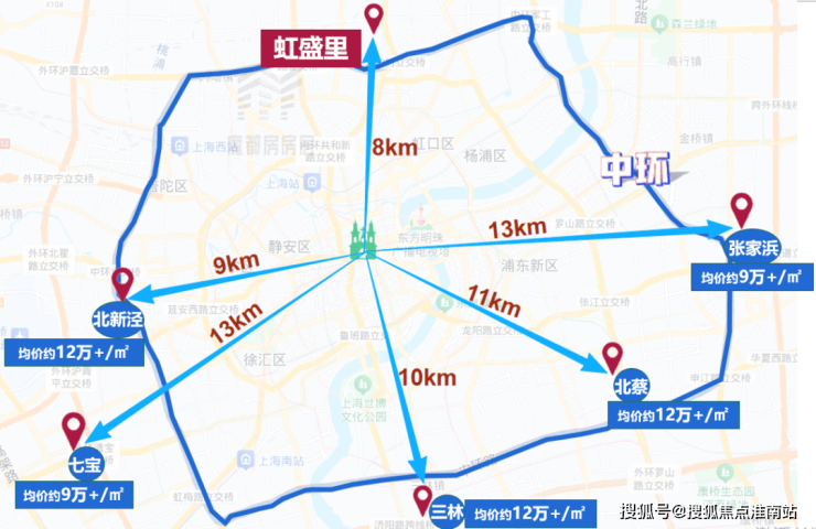 但到人民广场的距离却更远了!例如位于上海南部、浦东三林板块的项目,距人民广场直线距离约10公里,价格却要12万+/㎡,还有位于上海西面的北新泾项目、上海东面的北蔡项目等等。