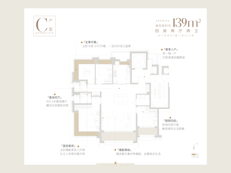 建面约139㎡户型,定制规格全面升级,玄关+背景墙由岩板升级为奢石,芬迪白、万象山河、海蓝之谜三选一,天然肌理自带传世质感,每一寸都彰显高端格调。地板升级为百亿豪宅世博天悦同款造型,更匠心融入嵌铜工艺,质感再升阶,颜色可在深浅两色中甄选,花纹更有三种款式可选。